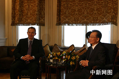 當地時間二月一日上午,正在英國訪問的中國總理溫家寶在下榻飯店會見了英國前首相布萊爾(左)。溫家寶表示,此次春節期間訪問英國,表明了中方對中英關系的重視。布萊爾對溫家寶的到訪表示歡迎。中新網記者 張朔 攝