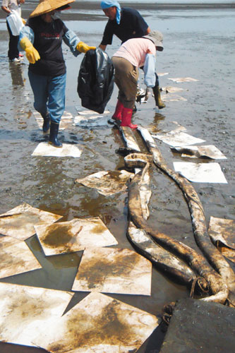 由于油污面積很大,大批消防及環保人員在濕地忙著除油,將吸油棉布丟入海灘,并布下攔油索框住油污,保護水筆仔、彈涂魚等自然生態,相關單位表示,初步已控制,油污不再擴散,攔油工作一直持續中。