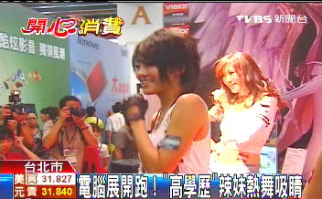據臺灣TVBS電視臺報道,臺北計算機展大會舞臺還沒開鑼,參展廠商就派巧克力膚色辣妹開始搏版面,沒有舞臺就在展場地毯展現動感。有的廠商由于和隔壁搞競爭搶眼球,上午11點半的Show Gilr表演,足足提早1小時。