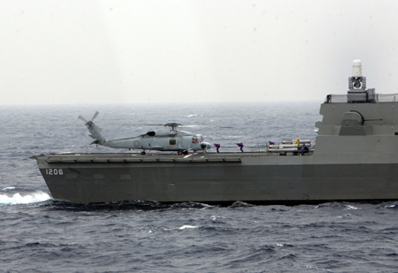 臺灣海軍今天在高雄左營基地舉行春節戒備操演,重點加強反潛艇演習,動員了大小總共十六艘各式艦艇與反潛機,執行包括反快艇作戰、緊急攻潛、海空協同反潛及空中戰力整補,過程相當逼真。“中央社”圖 張皓安 攝