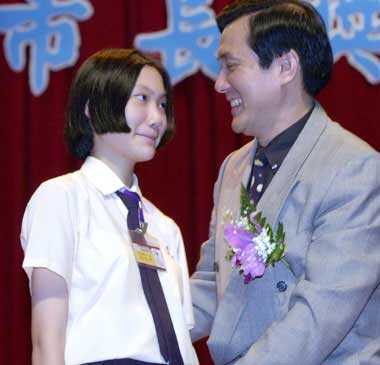 2001年6月2日,也就是7年前馬元中在龍山中學的畢業典禮,領的是市長獎,巧的是頒獎人就是爸爸馬英九,上臺時馬元中先喊了聲爸爸,活潑又顯得有些尷尬,感性的馬英九要女兒親一下,被小女兒連續拒絕2次,完全不給爸爸面子。