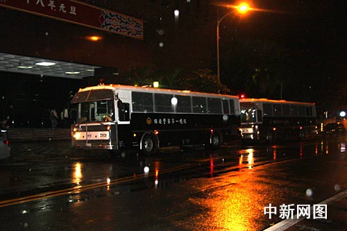圖為3時(shí)30分,臺(tái)北地方法院的警備車載著陳水扁離開臺(tái)北地院,前往臺(tái)北看守所后。臺(tái)北地院恢復(fù)平靜。保安警察也收工 ,乘車離開。 (中新社記者 陳立宇/攝)