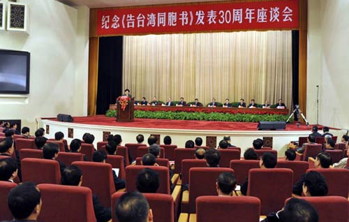 中新網(wǎng)北京12月31日電 紀念《告臺灣同胞書》發(fā)表30周年座談會31日上午在人民大會堂隆重舉行。中共中央總書記、國家主席、中央軍委主席胡錦濤出席座談會并發(fā)表重要講話。