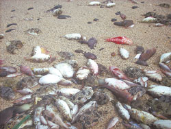 全鄉只有四千余人的望安,是由十八個島嶼組成,但除了望安本島外,其它都是無人島。洪嬡慧說,從春節以后望安的海灘上就開始出現死魚,最初還有不少民眾撿拾,專挑大尾的或還有口氣的,有些人一天可撿一百多公斤;但這兩天海灘上的魚都死了,已不再有民眾撿拾,因此是遍地魚尸,讓人寸步難行,只能用慘不忍睹形容。