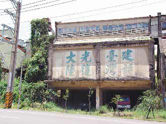 在苗栗縣三灣往南莊風景區路上,有棟廢棄建物墻上仍保留“建設臺灣,光復大陸”的斗大標語,字跡斑駁,卻引人注目。有人認為這些標語早已過時,大陸客來臺有極大商機,不必造成大陸客不快,建議涂銷;但也有人認為這是當年軍隊轉進來臺時的標語,是兩岸敵對狀況的歷史見證,頗具懷舊風味,應該保留。