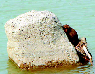 據臺灣聯合報報道,林務局工作站人員昨天上午經過高雄縣旗山鎮旗尾溪,發現有只臺灣小獼猴受困溪中,緊抱著溪中大石面對滾滾洪流動彈不得。