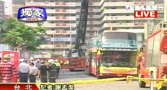 臺北市信義區松高路工地一架起重機從37樓高墜落砸中游覽車尾部,車上坐著25名廣東旅游團團員,當時他們用完午餐打算前往101大樓參觀,沒有想到意外從天而降,游覽車車體變形。