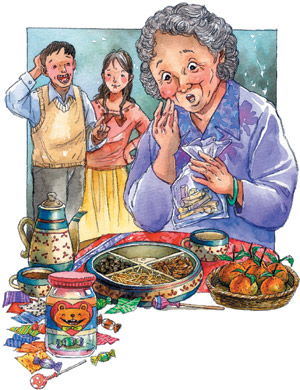 喔,老天爺,他居然把那么多甜到牙齒都會掉光的冬瓜糖全吃掉,我忍住驚呼,把媽媽拉到廚房,告訴她冬瓜糖的下落。