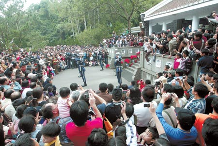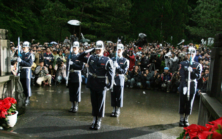 二十三日下午五點,位于桃園縣大溪鎮的兩蔣陵寢擁擠了大批游客,臺軍儀隊進行最后一次交接儀式后,陵寢管理處隨即撤哨封園。