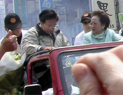 資料圖:2004年3月19日下午1點45分左右,陳呂兩人在臺南市金華路三段以車隊游行拜票時遭槍擊,陳呂兩人各中一槍,中槍后的陳水扁一度低頭察看傷勢。