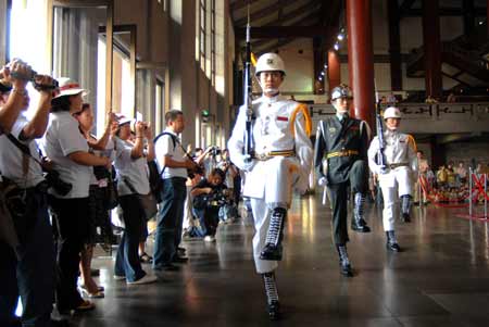 兩岸周末包機四日啟動,廣州首發旅游團抵臺后即前往臺北“國父紀念館”參觀,正好看到三軍儀隊表演,感到很興奮,手中相機拍不停。