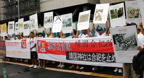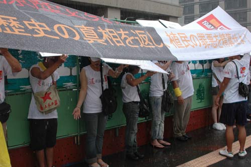據(jù)臺灣《聯(lián)合報》報道,一行50多人于中午時分前往日本國會議事堂旁邊的參議員會館前,高舉控訴日本殖民時期迫害臺灣少數(shù)民族的巨大布條及歷史照片,高喊“拒絕參拜”、“還我祖靈”、“日本反省、謝罪和賠償”等口號,表達他們對日本的抗議。