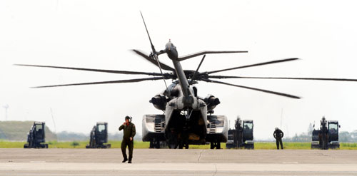 美國CH-53重型直升機17日降落臺南空軍基地,將投入莫拉克風災災后救援工作。