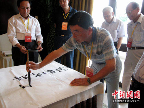臺灣退役將領黃幸強上將揮毫潑墨,書下“炎黃四海同吟望,互照相輝待月圓”。