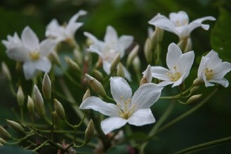 油桐樹開的花,被愛花人昵稱“桐花”,花開時(shí)白花成簇堆聚綠葉上頭,有如冬雪輕覆枝頭,加上花朵隨風(fēng)吹飄落,模樣更像是雪花,因而贏得“夏雪”美名,雖然四月便見桐花開,但因盛花期落在五月間,又有“五月雪”的封號。