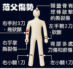 兇嫌的伯父則在警局氣得大罵:“這種事你怎做得出來?你父親若死了,你這輩子會關不完!”被砍殺的范父(37歲)全身刀傷超過10處,左手腕砍斷,右手肘則幾乎砍斷,因失血過多仍在醫院急救中。