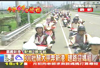 中新網(wǎng)4月19日電 據(jù)TVBS報道,大甲媽祖繞境,今天有一整排摩托車騎士要從大甲出發(fā),趕路到新港,車陣綿延了1、2公里之長,共約300臺,有秩序地排列著,也號稱是三百壯騎。