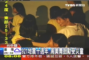 中新網9月8日電 據臺灣TVBS報道,臺灣921地震十周年,馬英九夫人周美青,7日下午以“周老師”的身份,陪當年的災童看紀錄片。