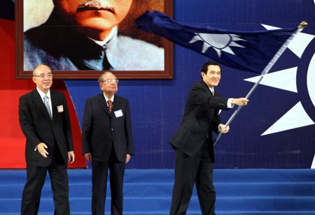 在主席監(jiān)誓人、國民黨選監(jiān)委員會召集人邱創(chuàng)煥的監(jiān)交下,馬英九從卸任黨主席吳伯雄手中接下印信、黨旗,宣告“馬主席時代”來臨,國民黨將邁向以黨輔政的“完全執(zhí)政、完全負(fù)責(zé)”新局。