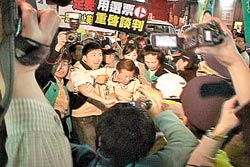 當時馬英九步行,沿路與商家住戶打招呼,拜托支持邱鏡淳,這個時候民進黨提名候選人彭紹瑾,也在謝長廷陪同下從學(xué)府路往建新街方向掃街。