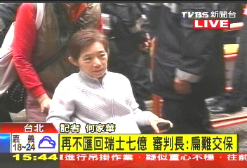 據臺灣TVBS報道,6月11日扁案就要二審宣判,今天再度開庭時傳喚陳水扁、吳淑珍、陳致中、黃睿靚等4人。法庭上,審判長當著扁家4個人的面表示,要他們盡速將瑞士4個賬戶,將近7億新臺幣的錢匯回臺灣,否則月底(4月23日)陳水扁即將羈押期滿,屆時想要交保,重獲自由機率等于是零。