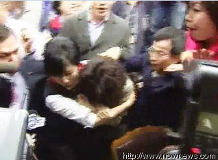 混亂中民進(jìn)黨籍“立委”邱議瑩被國民黨籍“立委”呂學(xué)樟推倒。國民黨籍“立委”徐少萍則是從背后熊抱民進(jìn)黨籍“立委”林淑芬,兩人因為重心不穩(wěn)跌倒在地上,徐少萍還堅持不放手,十分拼命。