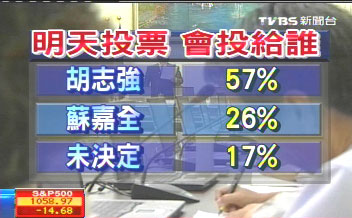 “假如明天就是投票日,您比較會投給哪一位?”結果胡志強以57%勝蘇嘉全的26%。 圖片來源:臺灣TVBS