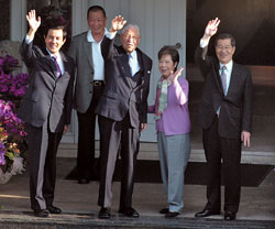 馬英九、蕭萬長27日下午4時半抵達李登輝寓所翠山莊。李登輝和夫人曾文惠在門口迎接馬蕭,四人臉上堆滿笑意。李登輝、馬英九主動向守候媒體揮了揮手,隨后一起走進屋內(nèi)。