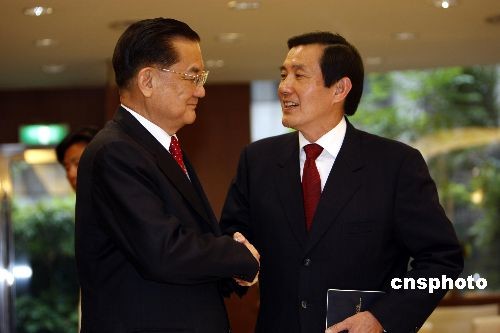 3月31日, 臺灣地區領導人當選人馬英九拜會國民黨榮譽主席連戰,向連戰請益。中新社發 杜洋 攝