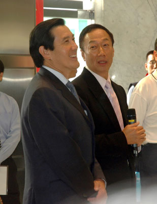 據(jù)“中央社”報道,郭臺銘今天下午四時,在位于臺北縣土城市的鴻海精密公司,親自迎接馬英九的到來。一進(jìn)入公司大廳,郭臺銘向馬英九介紹張貼在大廳梁柱的一幅對聯(lián)。