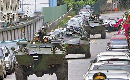 “大陸導彈來襲!人在圓山指揮所的陳水扁隨即搭乘裝甲車移防到桃園的第二預備指揮所,不料移防途中,在臺北縣郊區遭大陸特工攻擊,扁立即換車因應。”