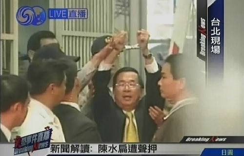 11月11日,臺檢方偵辦機要費案及陳水扁家庭疑洗錢案,今天上午第五度以被告身份傳喚陳水扁到案說明。經過6個多小時的偵訊后,陳水扁被檢方聲請羈押禁見,并銬上手銬,移送到臺北地方法院開羈押庭,等待法官裁決是否要收押。圖片來源:電視截圖