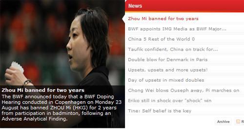 9月4日,世界羽聯在其官網上公布,中國香港羽毛球名將周蜜因服用違禁藥物被禁賽兩年,禁賽期從2010年8月4日開始至2012年8月3日結束。作為昔日中國羽毛球隊的主力一員,中國羽毛球隊總教練李永波對此做出回應。