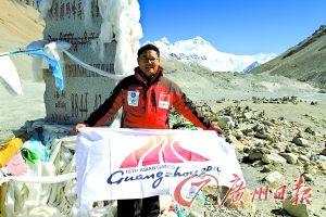 從廣州到溫哥華再到珠穆朗瑪峰,8個月的時間,上萬公里的路程,這幅肩負著廣州亞運會宣傳任務的旗幟終于飄揚在了珠峰。