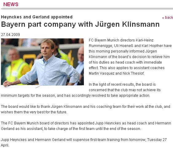拜仁俱樂部還給出了解雇克林斯曼的理由。俱樂部在聲明中說:鑒于目前球隊的比賽結果,俱樂部管理層擔心球隊可能完不成本賽季的最低目標,因此決定采取適當措施,走出目前的困境。