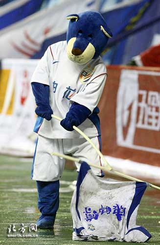 申花隊吉祥物扮演者將天津隊隊服放在地上拖動