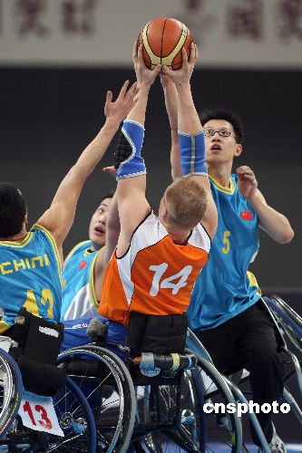 國際輪椅籃球邀請賽中國男隊無力阻擋荷蘭男隊進攻。