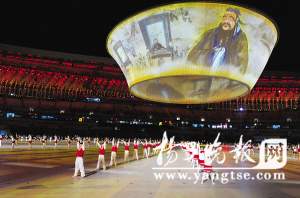 在預演現場,宏大的聲勢和“道具”令人震撼。就像北京奧運會開幕式用極具中國特色的畫卷作為核心道具展示古老神秘的東方文化,本次全運會上有一個特別作品,那就是一個巨型的碗狀帷幕。在晚間預演中,這個直徑大約有50米的“巨碗”從地面上緩緩升起,懸空而置。形成了一個類似巨型背投的裝置。隨著地面上節目的不斷變化,投射在“碗”幕上的影像也會不斷變換,制造強烈的視覺沖擊。