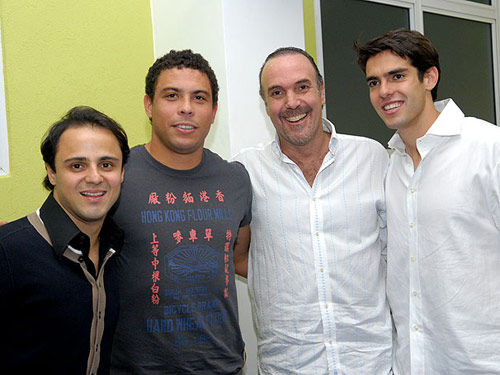 6 月10日是卡卡的兒子盧卡滿一周歲的日子,而當(dāng)天小盧卡的父親卻正跟隨巴西隊(duì)迎戰(zhàn)巴拉圭隊(duì)。為了彌補(bǔ)這個(gè)遺憾,上周日,卡卡特意在巴西圣保羅為兒子補(bǔ)辦了一個(gè)生日宴會(huì),邀請(qǐng)了埃拉諾、羅比尼奧、F1車手馬薩和羅納爾多等100多名嘉賓參加。光臨現(xiàn)場的其他嘉賓都是盛裝出席,沒想到羅納爾多卻穿著一件夠“潮 ”的體恤“閃亮”出場!衣服正面橫著幾個(gè)中文大字:“香港面粉廠”,旁邊像對(duì)聯(lián)一樣地印著“上等中糧白粉、特殊工藝……”等字樣,搞笑之極。在那排“香港面粉廠”的文字下面還有三個(gè)中文“單車嘜”,肥羅在搞笑之余還不忘體育鍛煉。