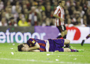 不過最讓巴薩不爽的還不是無奈將榜首席位讓給死敵皇馬,而是該隊頭牌梅西在比賽中兩度受傷。先是在第20分鐘,梅西在爭搶時,被對方身高1米92的中衛埃莫雷維埃抬腳亮出的鞋釘狠狠踩中右臉部,顯然埃莫雷維埃抬腳過高就是故意沖著梅西去的。梅西當即痛苦地捂臉倒地,隊醫立即進場緊急處理,好一會梅西才起身,但靠近右眼的部分已經被鞋釘劃出了一道很深的血口。但梅西還是堅持比賽,因此盡管梅西此戰沒能進球幫助巴薩取勝,但賽后梅西帶傷作戰的精神卻贏得了媒體的一致贊揚。但在第76分鐘,梅西因肌肉拉傷還是提前被博揚換下。據悉,梅西賽后檢查的結果是傷勢很重,極可能將缺席本周在歐冠、西甲中與國米、皇馬的兩場關鍵戰役。