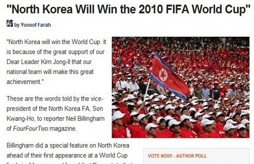 中新網6月7日電 據英媒報道,在抵達南非約翰內斯堡后,“神秘之師”朝鮮立刻開始了最后階段的備戰。小組賽他們被分在死亡G組,同巴西、葡萄牙、科特迪瓦一起爭奪出線權,形勢不容樂觀。但朝鮮足協副主席孫光浩在接受442雜志的訪問時雄心勃勃地表示:“朝鮮隊將會奪得世界杯冠軍!”