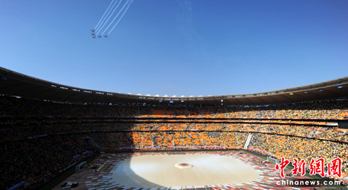 約翰內斯堡能容納94700人的足球城體育場今天座無虛席。南非總統祖馬、前總統姆貝基、德克勒克和,和墨西哥總統阿爾德隆等政要出席了今天的開幕式。南非前總統曼德拉因曾孫女車禍身亡,將不出席今天的開幕式。