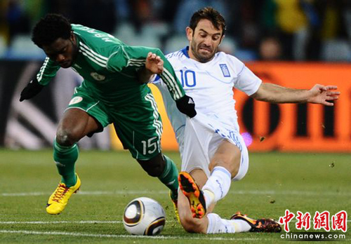 中新網6月17日電 北京時間今晚22時,南非世界杯B組第二輪比賽打響,由歐洲勁旅希臘在布隆方丹的自由洲球場迎戰非洲雄鷹尼日利亞。上班時尼日利亞任意球率先破門,但此后被紅牌罰下一人,希臘隊隨即抓住機會,在上下半場各入一球,以2-1逆轉擊敗尼日利亞隊。