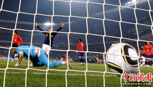 智利隊的進攻,也讓他們付出了比較慘重的代價。從15分鐘到21分鐘的短短6分鐘內,裁判竟然向他們出示了三張黃牌,得牌者分別為梅德爾,龐茨,埃斯特拉達。智利隊的大舉進攻,也讓他們的后防線空虛,第24分鐘,西班牙隊前鋒托雷斯左路帶球突破,智利隊門將布拉沃貿然出擊,將球斷下但擊打到中場,球到了比利亞腳下,后者沒有調整直接起腳吊射空門,1比0,西班牙隊領先!這也是比利亞本屆世界杯的第三個進球。
