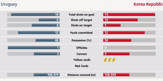 韓國隊在場上更加咄咄逼人,他們的犯規次數和烏拉圭隊都是12次,但是韓國隊因為侵犯對手吃到三張黃牌。烏拉圭隊有一次越位,兩隊的角球都是3個,旗鼓相當。