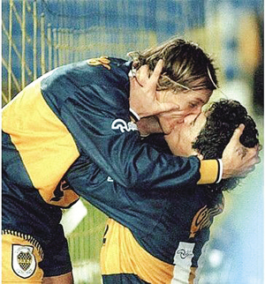 阿根廷人的豪放這一刻展現(xiàn)得淋漓盡致,主角是球王和風(fēng)之子。當(dāng)時(shí)風(fēng)之子接到球王的妙傳破門得分,兩個(gè)人當(dāng)場(chǎng)不顧全場(chǎng)所有觀眾和其他的隊(duì)友激吻在一起,長(zhǎng)達(dá)6分鐘,而且還是“舌吻”!當(dāng)時(shí)引起了全世界的轟動(dòng)!好戲還在后頭:卡尼吉亞的老婆說:“馬拉多納是同性戀,他喜歡親吻卡尼吉亞的嘴唇。”當(dāng)然老馬很生氣,但是他表示:“看在卡尼吉亞的份上就不追究了!”