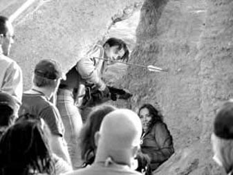 昨日(18日)拍攝的這場戲講的是布蘭登·弗雷澤與瑪麗亞·貝羅遭到敵人的追殺,二人在沙漠中一邊躲避弓箭的襲擊,一邊還擊,雕翎箭與短槍的交火頗有些“關(guān)公戰(zhàn)秦瓊”的味道。布蘭登扮演的里克一身牛仔裝扮,手拿一把短槍,依舊延續(xù)了前兩集中的扮相,而瑪麗亞扮演的艾芙琳則穿著深棕色短款夾克,足蹬馬靴,手持一把手槍。導演羅伯·科恩一聲“開始”后,他們在巖石后緊張地躲避著敵人的追趕,此時,一支雕翎箭射來,擦著布蘭登的右臂射進土墻,布蘭登立即伏地掩護瑪麗亞,并迅速用槍還擊,而瑪麗亞也起身與他并肩作戰(zhàn)。盡管這個鏡頭在片中只出現(xiàn)短短的10秒鐘,但科恩導演還是讓兩位主演拍了3遍。