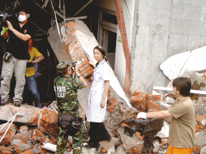 昨日,在德陽市第六人民醫院住院部的廢墟中,蔣雯麗蹲在一片廢墟之中,身上、臉上全是泥灰,導演一喊開始,蔣雯麗用雙手在鋼筋瓦礫的廢墟中扒找自己的同事和醫藥箱。拍攝現場,混凝土板塊還懸在半空中,搖搖欲墜。拍攝中,蔣雯麗還被擦傷。