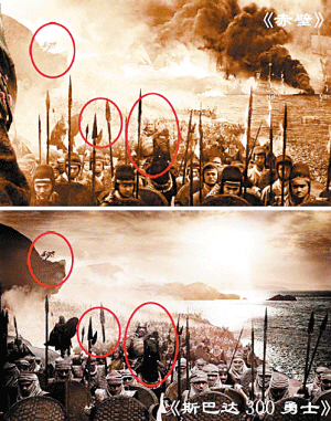一張《赤壁》和《300勇士》的對比照昨日成為網友熱議的焦點。照片發布者圈出吳宇森新片《赤壁》官方海報中和《斯巴達300勇士》劇照的相似之處,并直指《赤壁》抄襲。對此中影營銷分公司負責人直斥“無聊炒作”,并稱“每款海報都有不同的風格。”