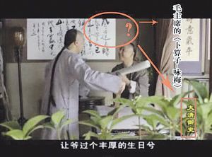 近日,央視國(guó)際頻道播放的古裝電視劇《大清御史》里,毛澤東的詞《卜算子•詠梅》居然懸掛在清朝乾隆年間的官員錢灃的書房里。(3月29日《揚(yáng)子晚報(bào)》)
